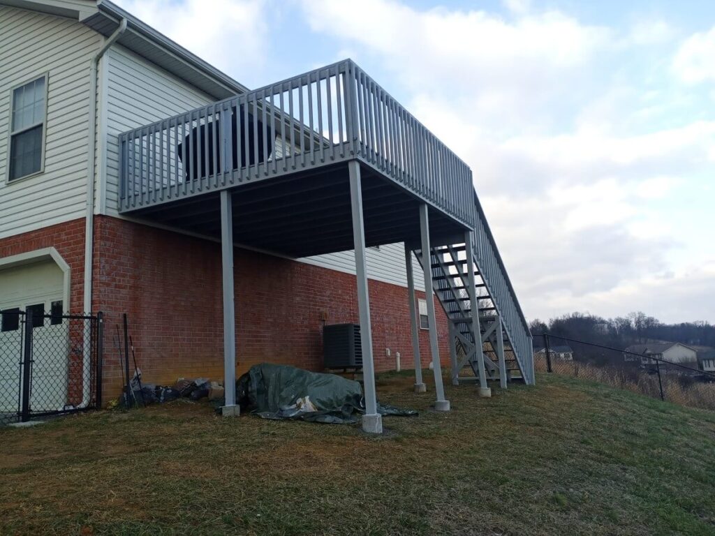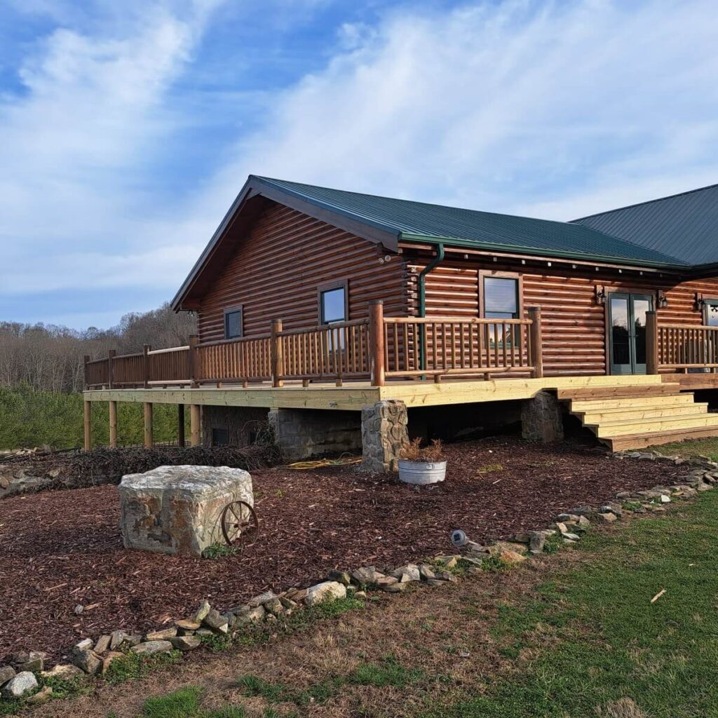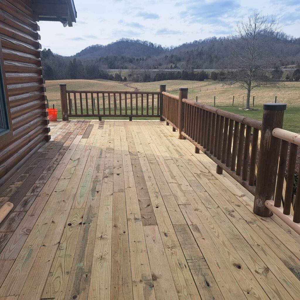 Full structural rebuild of an 11×75′ elevated deck at a log cabin.